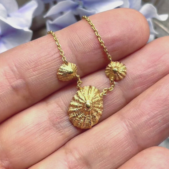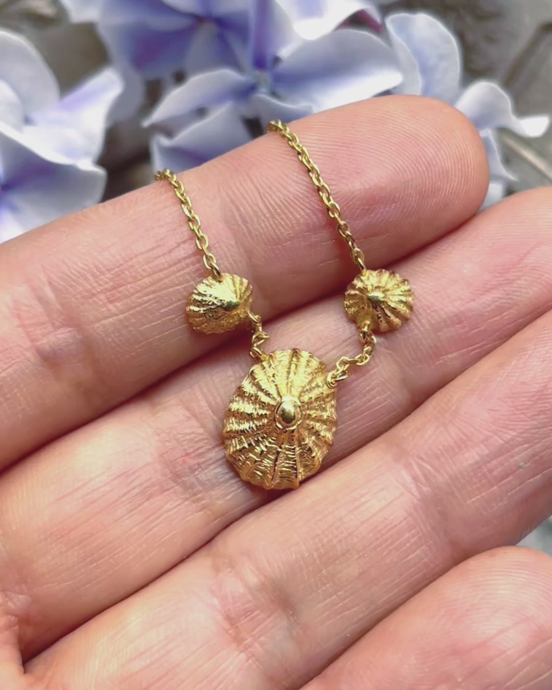 Composé de trois coquilles glanées sur les plages bretonnes, ce collier a été pensé pour se poser juste au creux de la clavicule.
