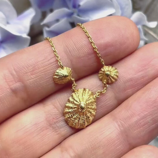 Made of three tiny shells found on a Brittany beach, it’s designed to sit delicately at the collarbone.