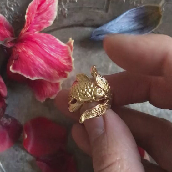 A hand-sculpted Goldfish Ring from The Eat Yourself collection, meticulously carved in sterling silver 925 and plated with 18K gold.