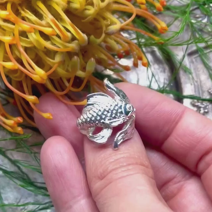 A hand-sculpted Goldfish Ring in solid sterling silver 925, revealing the pure and subtle beauty of its material.