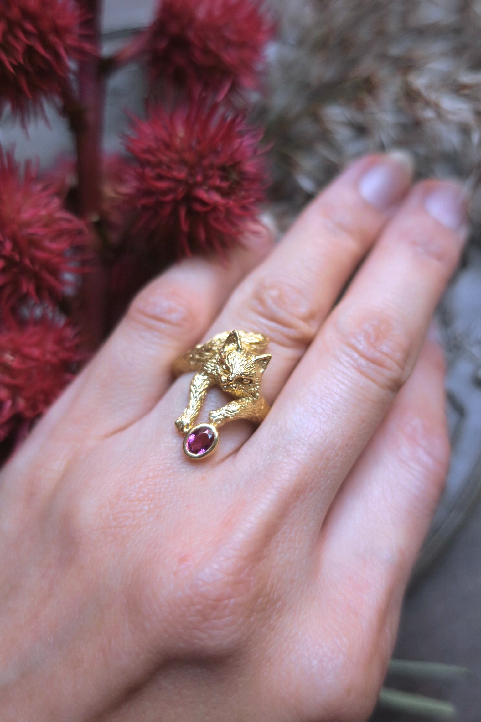 “Leonaldo” long haired cat ring in 18KGP silver 925 with a beautiful rubellite( red tourmaline), made in Paris.